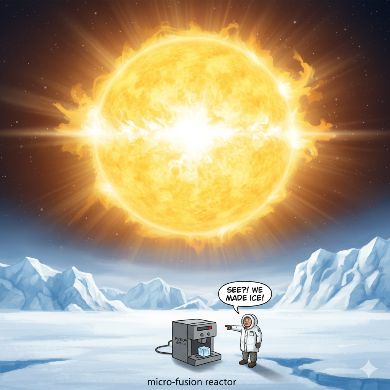 我们每天都能看到一个巨大的免费聚变反应堆出现在一亿英里外,却要人造微型聚变反应堆,这很荒唐。就像在南极摆放一台小小的制冰机,然后说:看,我们制出了冰。而你本来就在南极。